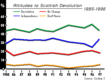 These tables show trends in support for devolution since 1985 within Scotland. There is very little data from the period between 1979 and 1985 as there was little media interest in the issue. System Three changed their question in the middle of 1996 to make it similar to the one which will be on the ballot paper for the referendum. Previously, respondents were given the choice between independence, devolution and the status quo.
